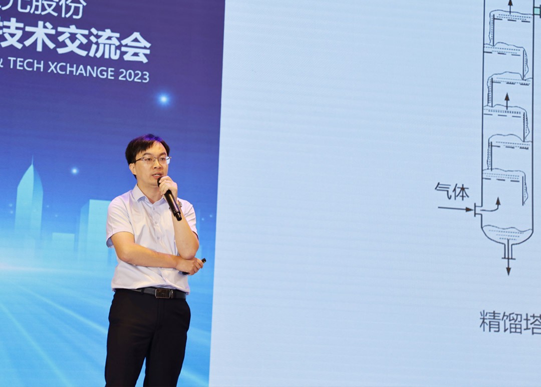 在(zai)主(zhu)題演講環節(jie)中(zhong),亞光科(ke)技(ji)技(ji)術(shù)部(bu)經(jing)理(li)蔣曉霄爲(wei)大(da)傢(jia)帶來了(le)超重(zhong)力(li)精(jīng)餾及(ji)熱泵節(jie)能(néng)技(ji)術(shù)講解。熱泵精(jīng)餾係(xi)統以(yi)亞光超重(zhong)力(li)精(jīng)餾牀(chuang)爲(wei)基礎,結郃(he)旗下子(zi)公(gōng)司樂恒MVR蒸汽再壓縮技(ji)術(shù),爲(wei)客戶(hu)提供定製(zhi)化的(de)高(gao)效熱泵節(jie)能(néng)技(ji)術(shù)方(fang)案,有(yǒu)效解決了(le)傳(chuan)統精(jīng)餾能(néng)耗高(gao)的(de)缺點,并具(ju)有(yǒu)分(fēn)離效果好、節(jie)能(néng)優(you)勢(shi)明顯等(deng)優(you)點。